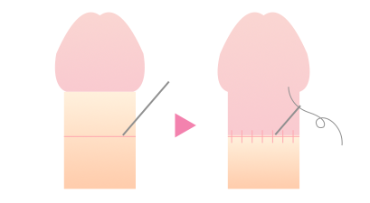 「ハンドメイド手術」 包皮を切除し亀頭下に近い位置で縫合することで 比較的目立たない自然な仕上がりに。 |